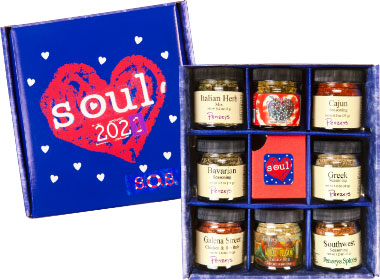 Box Contains: 1/4-cup jars of Italian Herb Mix, Penzeys Revolution, Cajun Seasoning, Bavarian Seasoning, Greek Seasoning, Galena Street, Mural of Flavor, and Southwest Seasoning. Plus a soul pin and helpful tip cards.