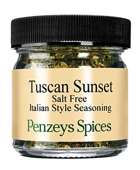 Hand-mixed from: basil, oregano, red bell pepper, garlic, thyme, fennel, black pepper and anise. To make oil & vinegar salad dressing: Cover 1 TB. Tuscan Sunset Seasoning with 1 TB. water, let stand a few minutes. Add 1/3 cup olive oil and 1/4 cup balsamic